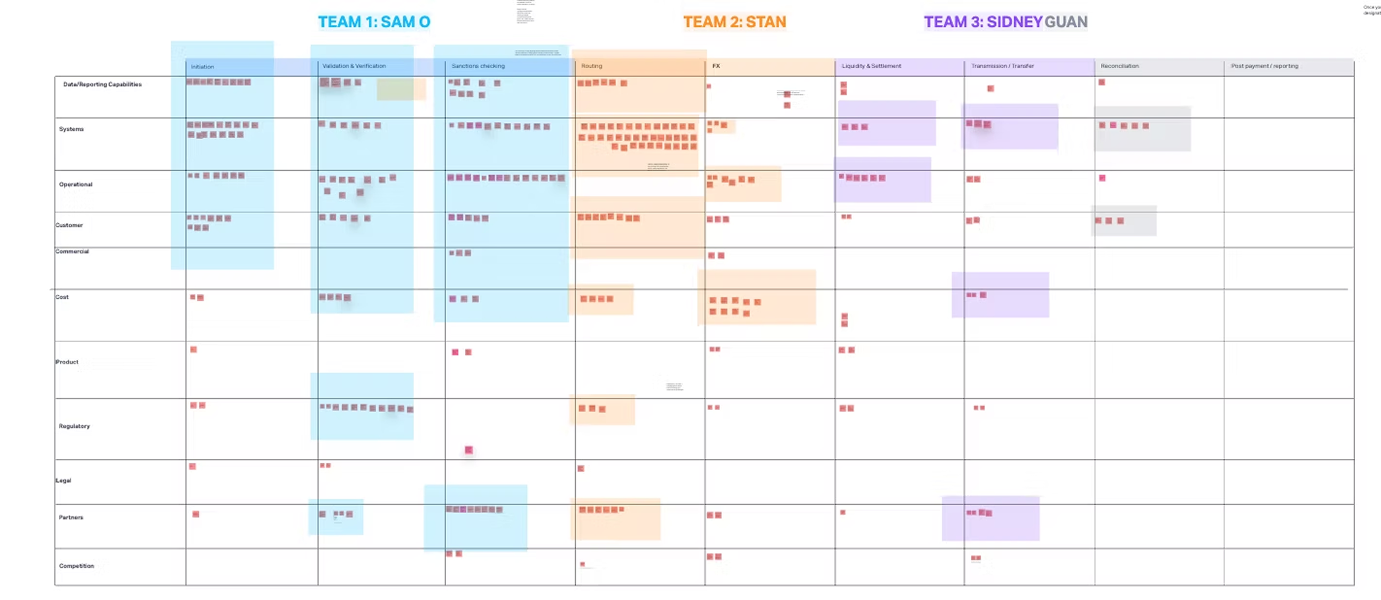 The second workshop used the heat map as its starting point. Working with key stakeholders, the team conducted a root cause analysis of the clustered pain points - drilling beneath the surface symptoms to identify the underlying issues driving inefficiency in cross-border payments. Five root causes were identified: