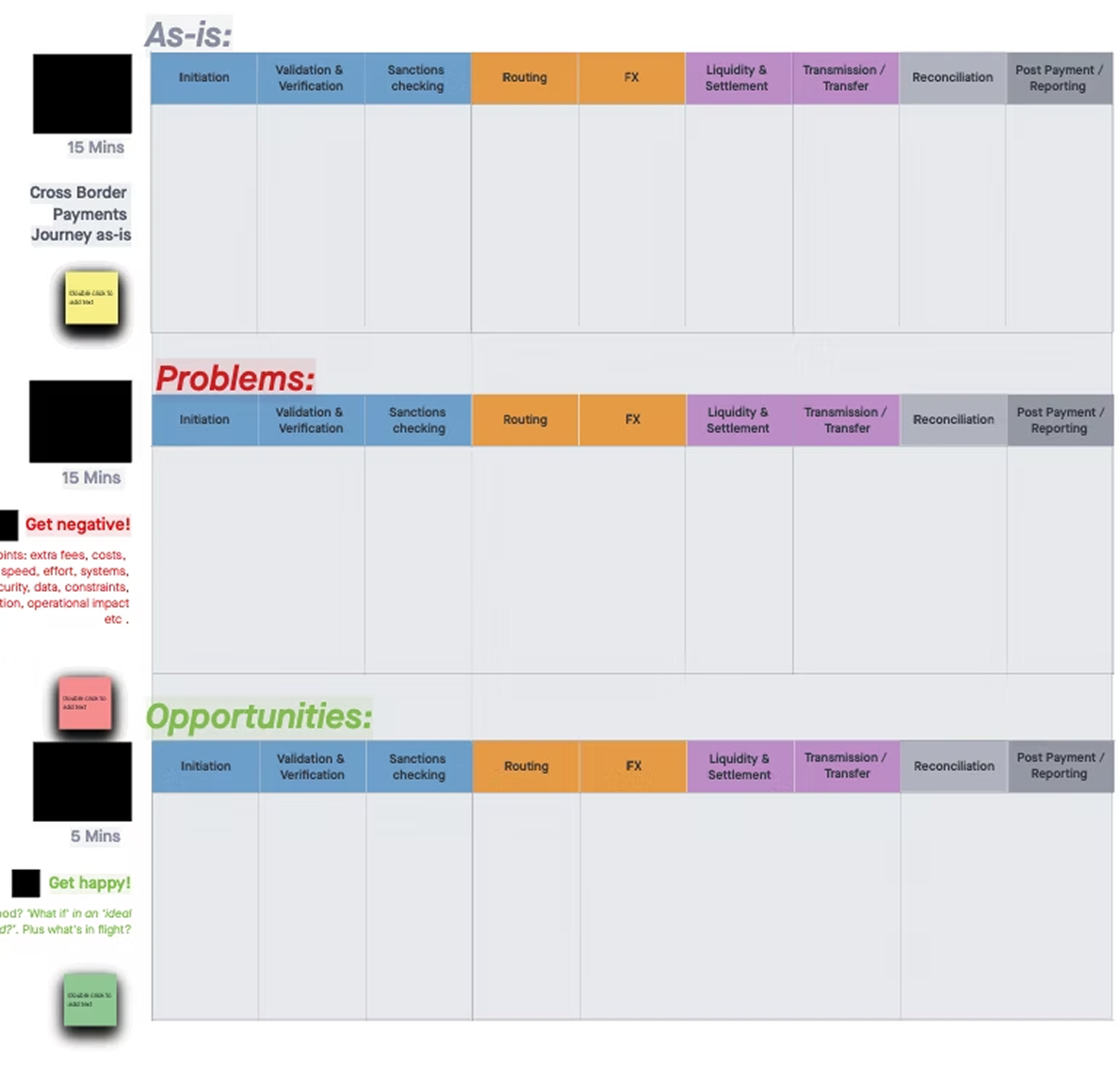 - Understand the current process - gain a deep understanding of the existing cross-border payment journey, highlighting pain points and opportunities