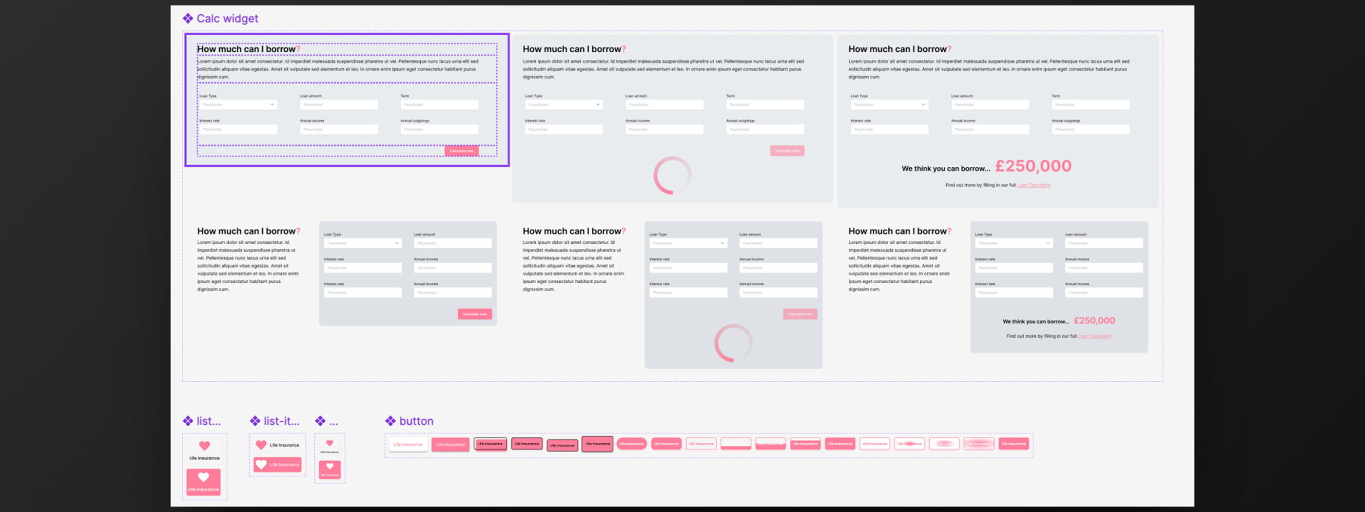 What the existing design lacked was distinctiveness. It was restrained to the point of being forgettable. I pushed the visual language forward by introducing more striking hero imagery, glassmorphism to modernise the feel of key UI surfaces, and a design systems approach that imposed rigour the project had been missing. I also built a working mortgage calculator directly in Figma using variables — an interactive prototype that functioned like the real thing without requiring a line of code, well ahead of when this kind of Figma capability became commonplace.
